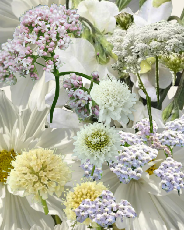 Hvidlige scabiosa, ærteblomster, hjemmehørende stauder, valmuer og cosmos til buketter fra juni til frosten kommer.