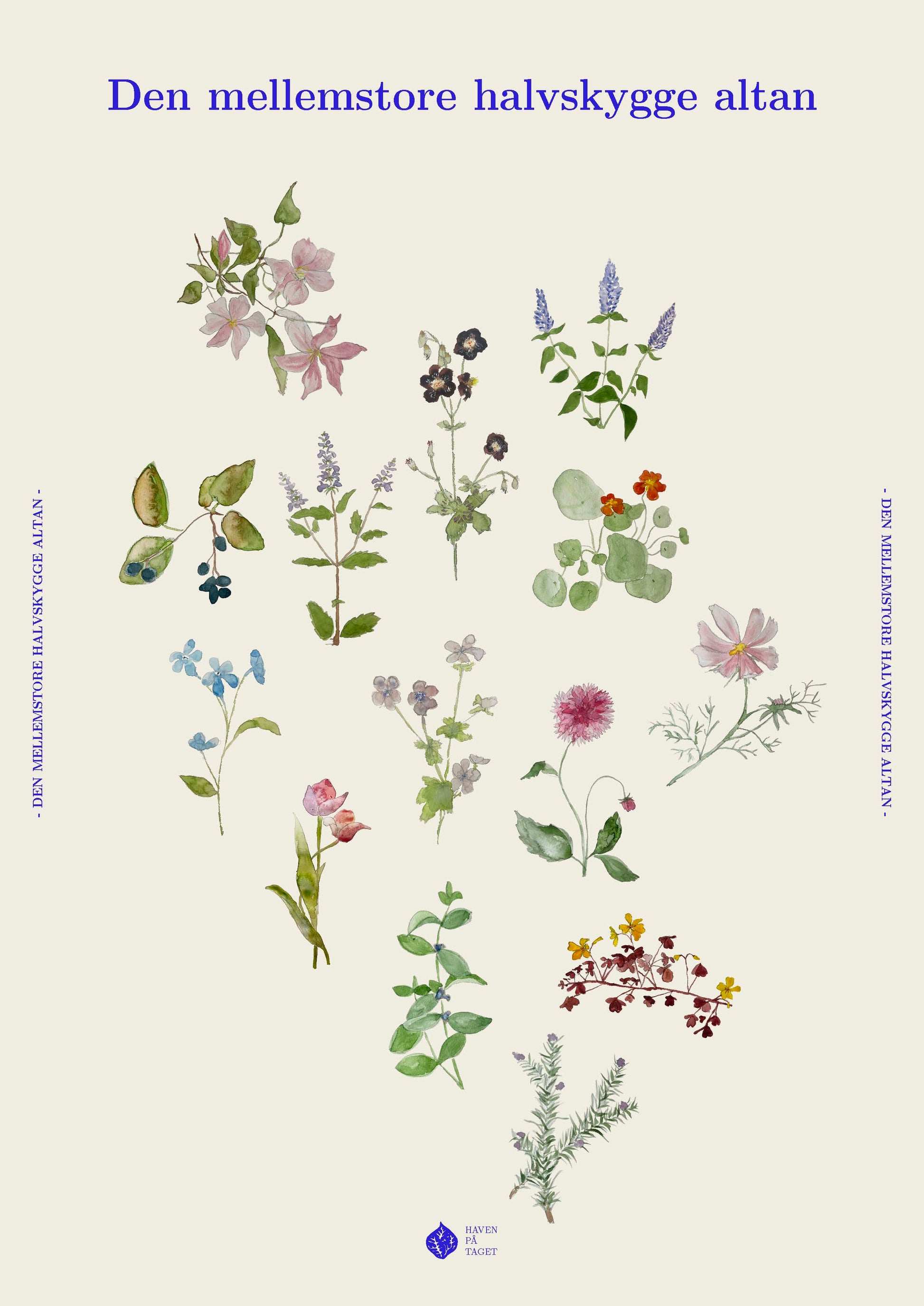 En altan - uanset størrelse og orientering ift. til lys - giver dig en fantastisk mulighed for at skabe et grønt uderum. Man skal, efter min bog, ikke være bange for at plante meget og mange forskellige ting på sin altan. Et frodigt lille fristed giver så meget glæde i hverdagen. Her får du et konkret forslag til, hvordan du kan indrette en stor, halvskygget altan med blomster, krydderurter, klatreplanter og små træer og buske.