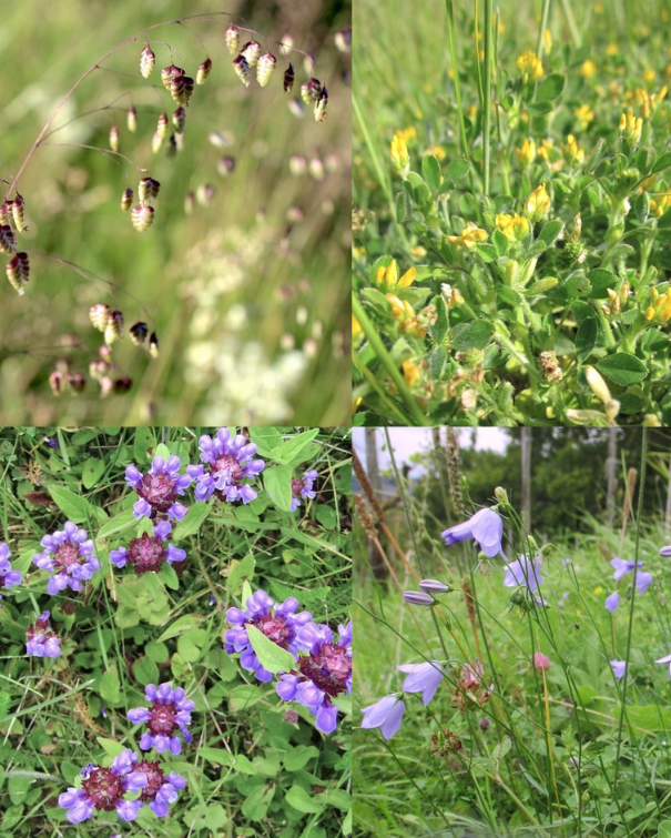 Foto af hjertegræs, humlesneglebælg, alm. brunelle, liden klokke.